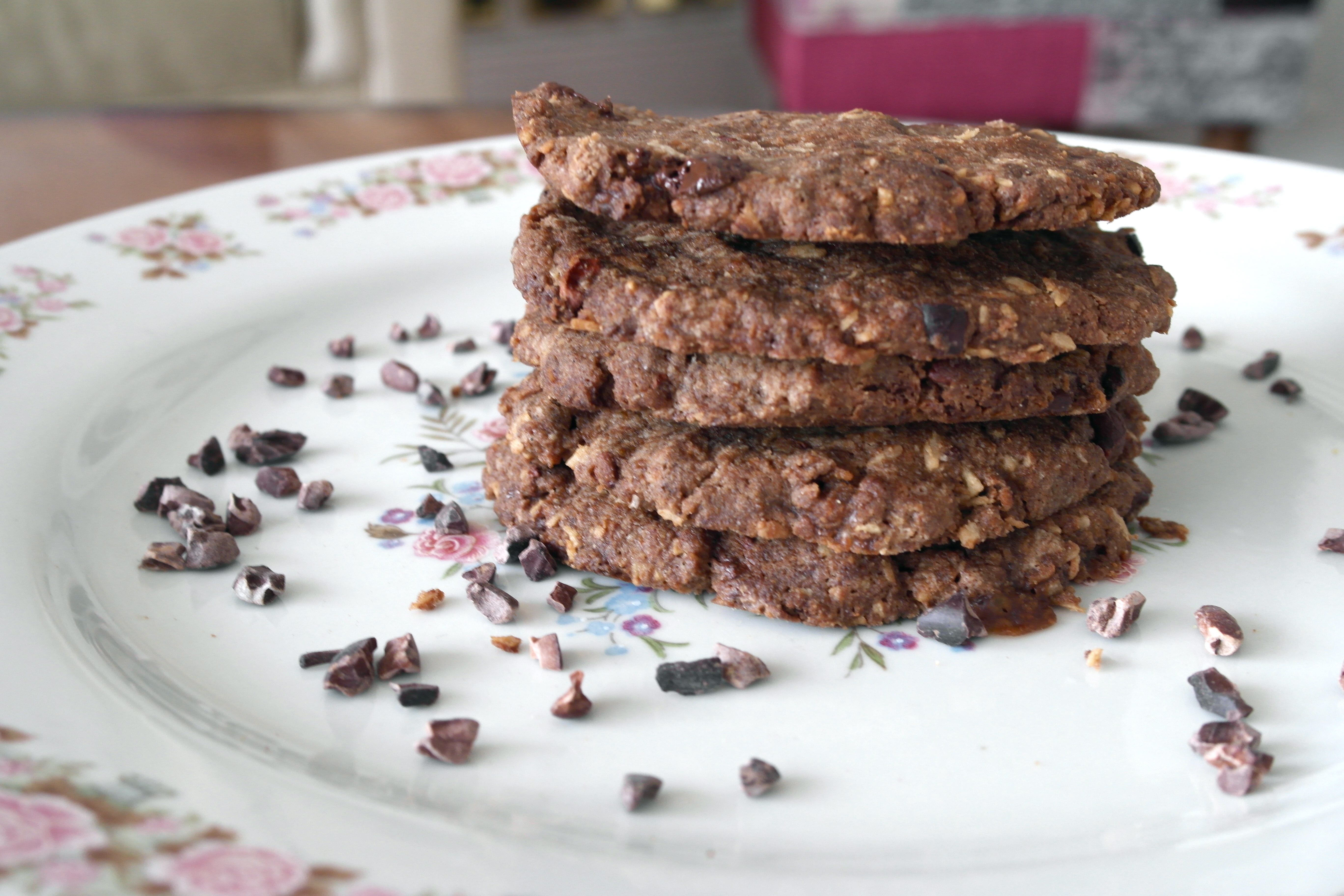 In a saucepan melt the coconut oil and add in the coconut sugar, vanilla extract and syrup. Slowly mix in the flour and flaxseed mixture, stirring until just incorporated. Fold in the roughly chopping chocolate and cacao nibs.