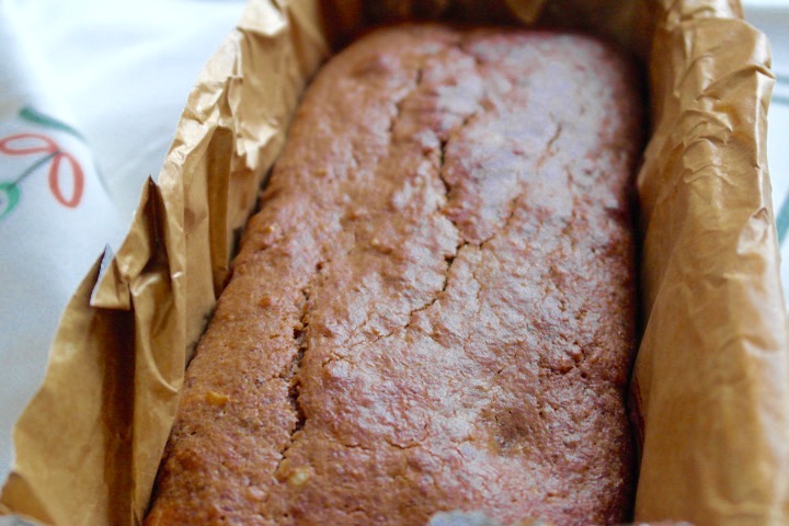 Mash the bananas in a bowl and add the remaining wet ingredients. Stir until all is combined. In a separate bowl, combine the dry ingredients and mix. Fold the dry ingredients into the wet ingredients until all is incorporated. Pour the batter into the loaf tin.