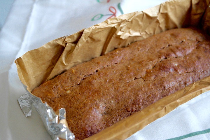 Mash the bananas in a bowl and add the remaining wet ingredients. Stir until all is combined. In a separate bowl, combine the dry ingredients and mix. Fold the dry ingredients into the wet ingredients until all is incorporated. Pour the batter into the loaf tin.