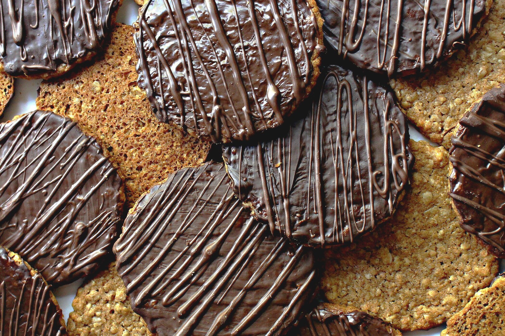 In a large mixing bowl combine the biscuit base ingredients and stir well so that everything is all nicely combined. Scoop out a tablespoon of the mix and place onto the tray; flatten into a small to medium hobnob sized circle biscuit. Repeat until you make 12. Bake for 15 to 20 minutes until light gold on the edges. The biscuits might still seem a little soft in the middle but they will harden once they cool. Leave them on a cooling rack for half an hour.