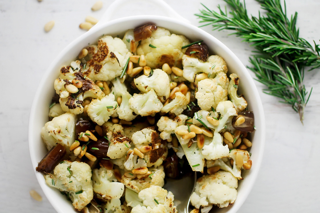 Mix roasted cauliflower, dates and fresh thyme/rosemary into the pan with the pine nuts. Transfer to a serving dish and season with additional sea salt and pepper if needed.