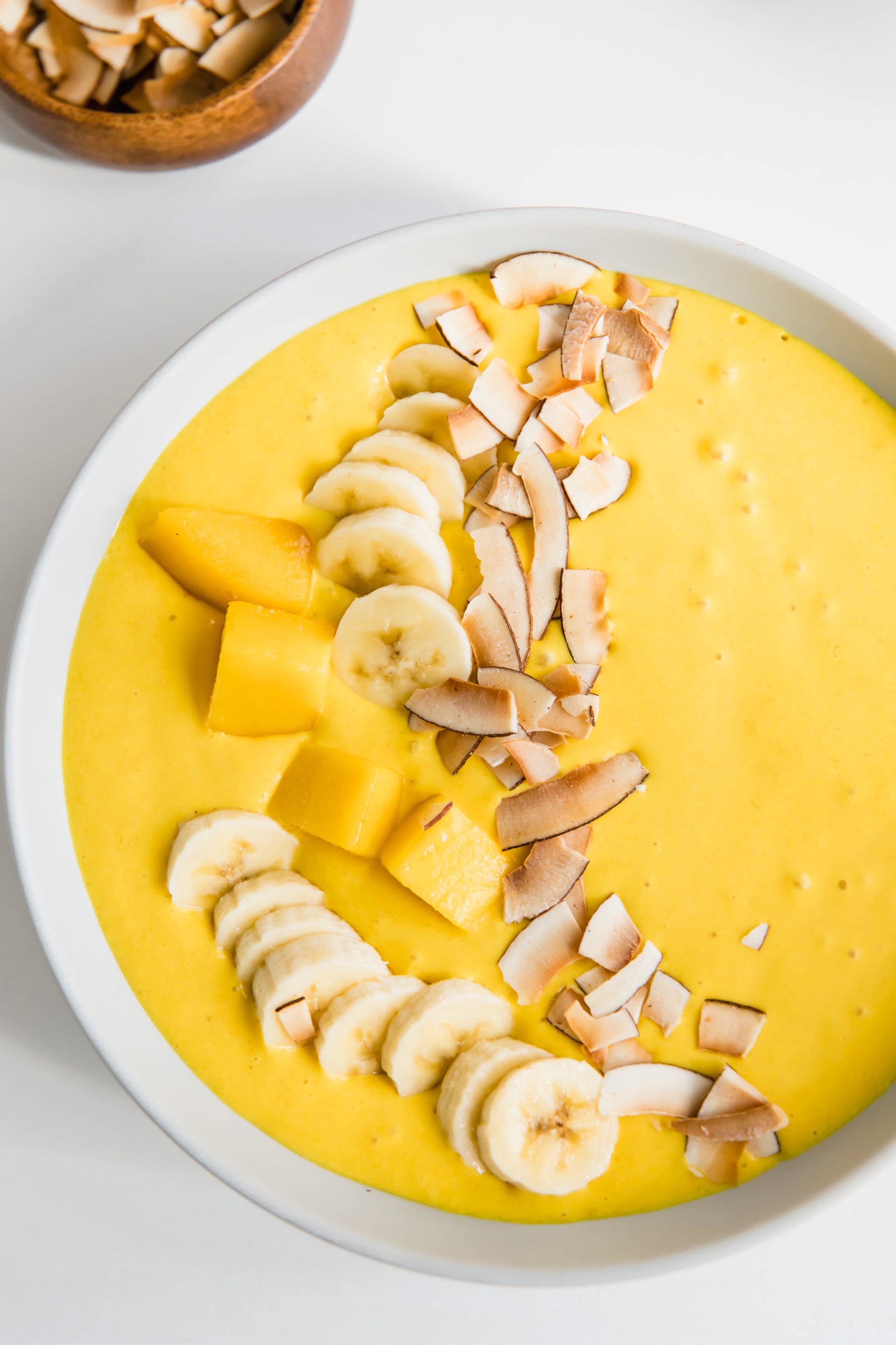 The base of the smoothie is frozen bananas and then I added a little mango. You could definitely make it with any fruit really! Then I added a little turmeric, which is completely optional! I just love it because of it’s anti-inflammatory properties but remains quite subtle in flavour and gives an incredible golden sunshine colour to the bowl.