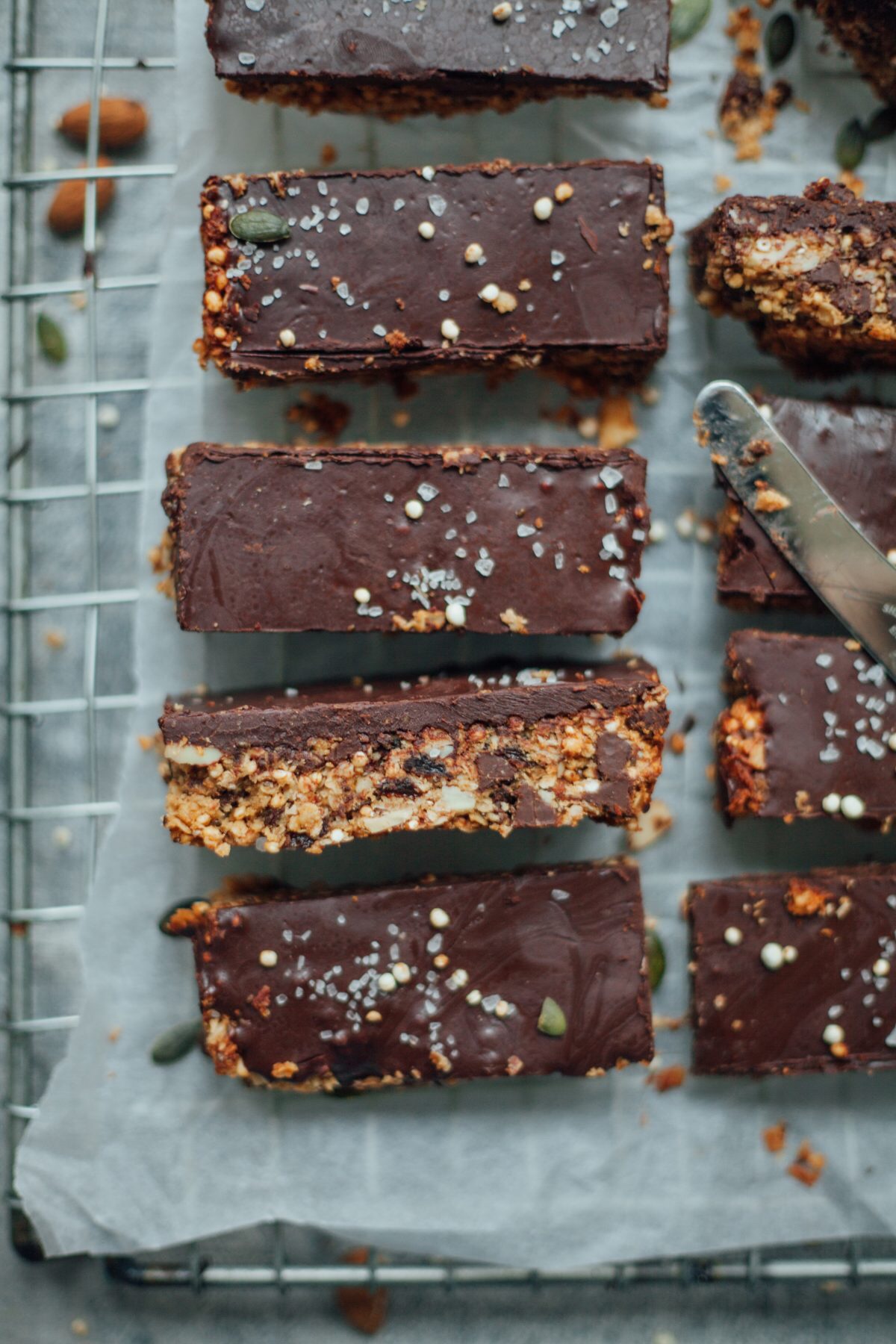 Once fully cooled melt 1/2 cup of chocolate chips and spread over the top of the flapjack then put aside to set. Once set, cut into bars and enjoy!