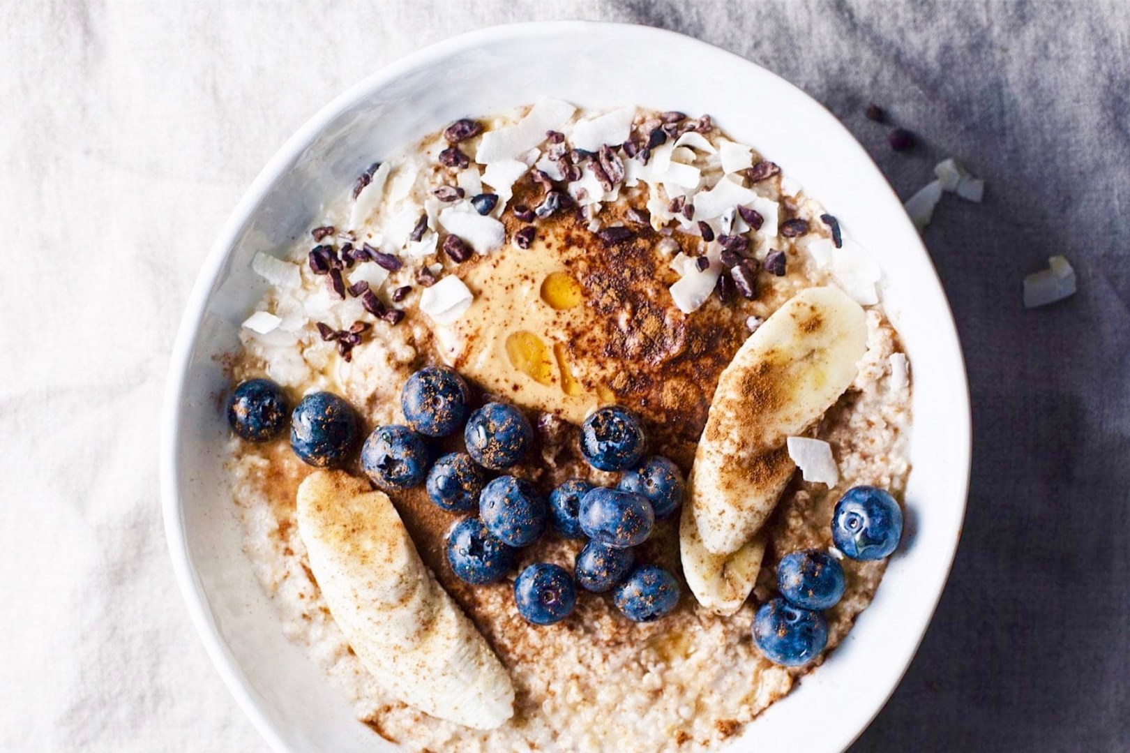 Pour porridge into two bowls and decorate with blueberries, banana, cacao nibs, a dollop of among butter, coconut flakes, more cinnamon and maple syrup for sweetness.