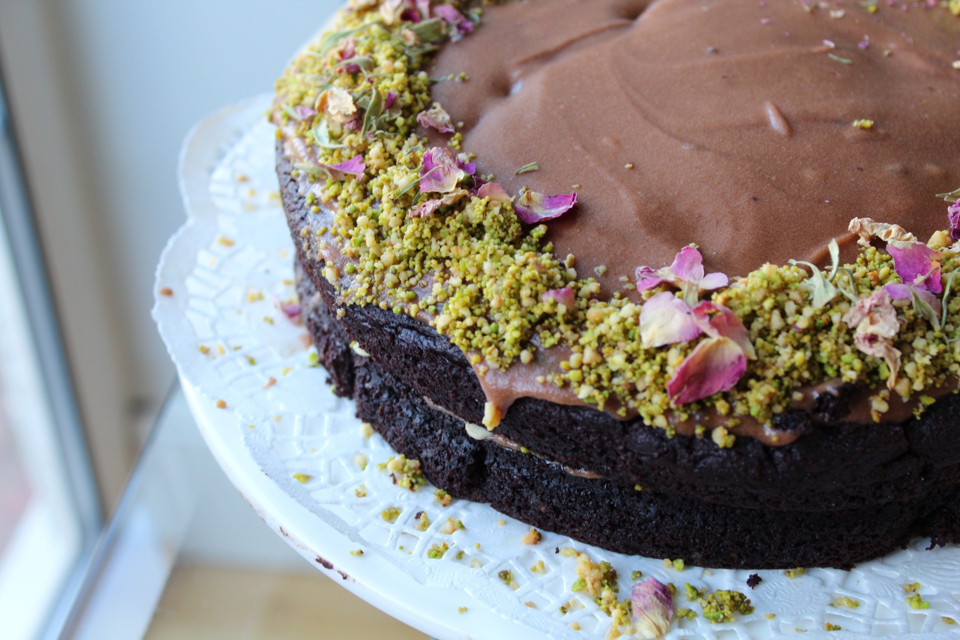 This cake is decadent and fluffy while being a bit dense (the way that I prefer my chocolate cake) and the frosting is creamy and delicious! I’ve topped it with ground pistachio as I find it compliments the rich chocolate so well.