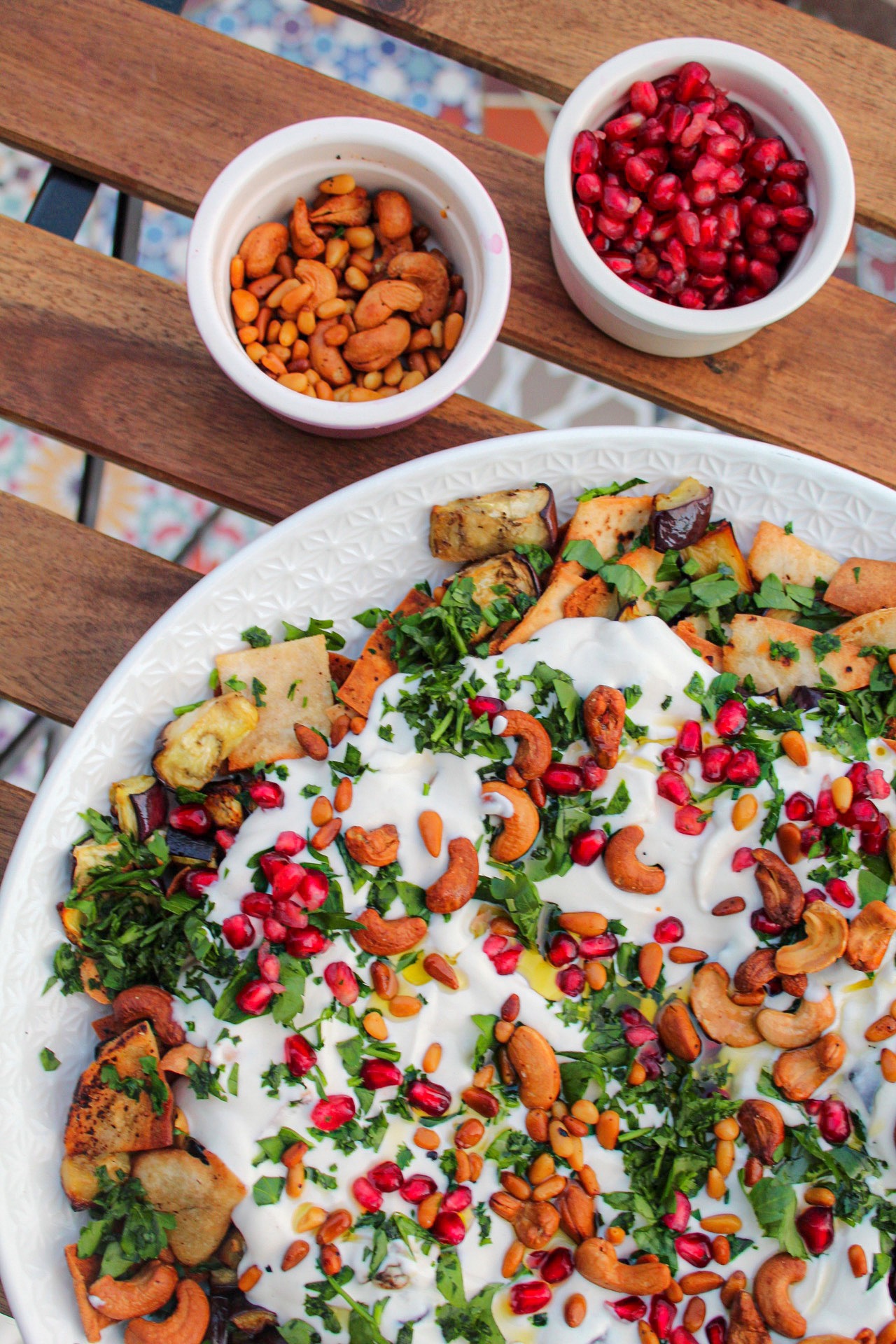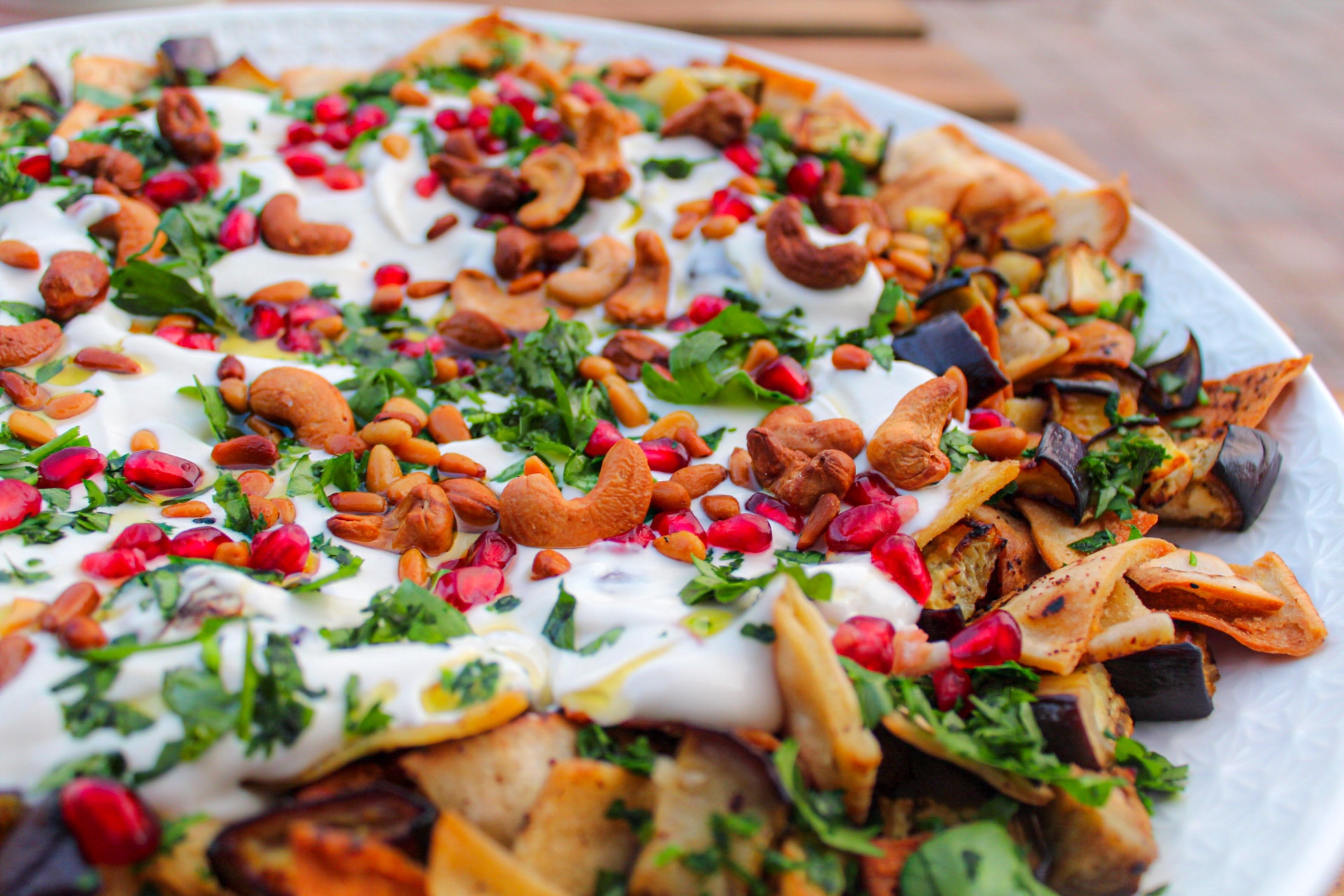 This Aubergine Fatteh is a middle eastern classic that is completely vegetarian and versatile. It’s one of my favourite recipes to make because it’s so easy and goes down really well on the dinner table. The combination of flavours is absolutely perfect; it’s a crunchy, full of savoury goodness platter that will leave you wanting more! I like topping with pomegranate because it goes beautifully with the garlic and lemon dressing.