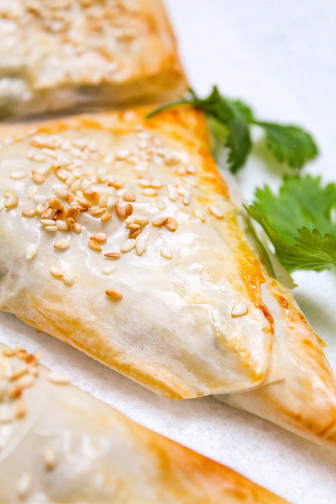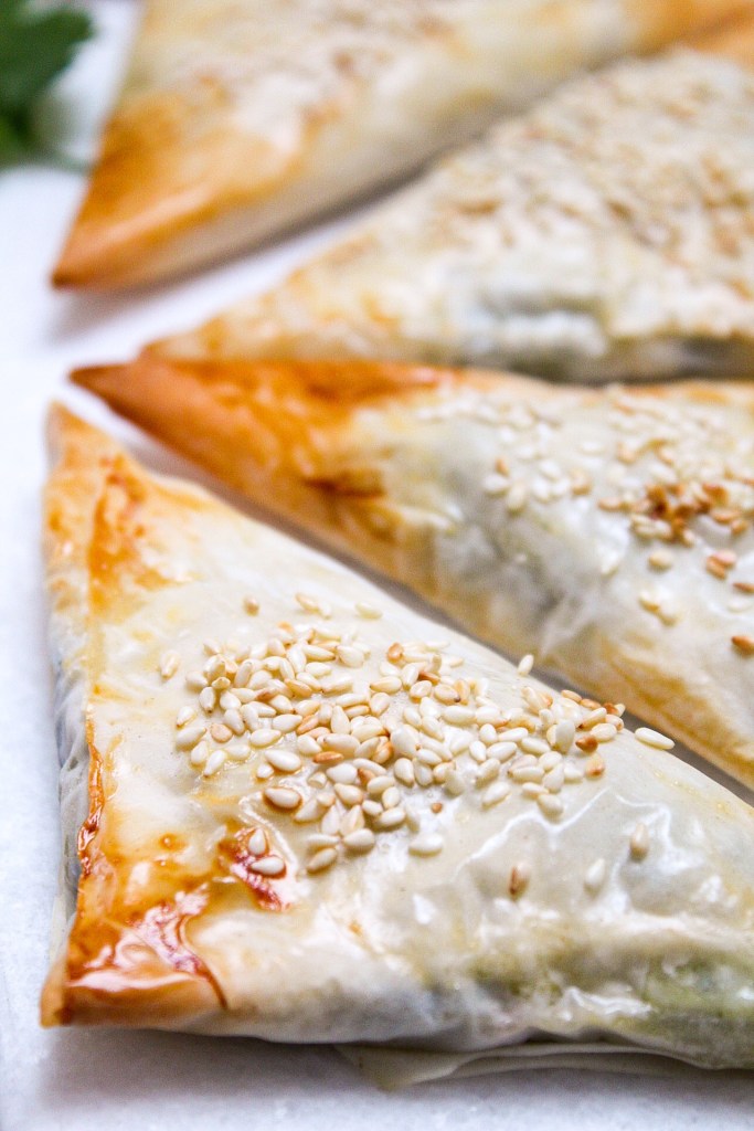 Apply one tablespoon of the cheese mix at the end of the pastry and then fold it onto itself into a triangular shape. Top with a glaze of butter and sprinkle of sesame seeds. Line a baking tray with baking parchment, placing each borek, spaced apart.