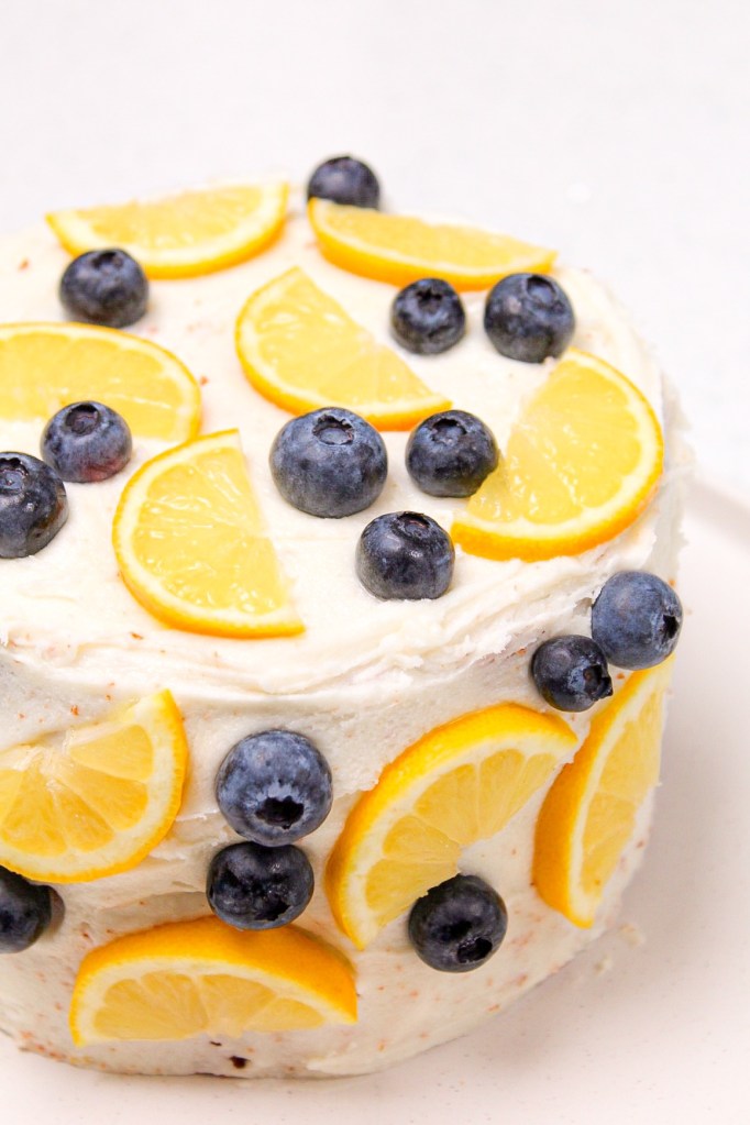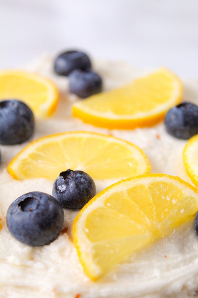To perfect this, I use lots of lemon juice in the batter; top the cake with a generous amount of frosting once it is baked, AND top it with lemon slices and blueberries when cooled.